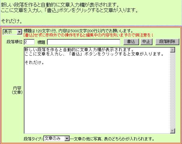 新しい段落を作ると自動的に文章入力欄が表示されます。 ここに文章を入力し、「書込」ボタンをクリックすると文章が入ります。 ほぼそれだけ。 あとは多少のコツですが、 | ・ | 内容のまとまりごとに段落を分けて作成しておくとあとで編集や制御が楽です。 ・段落ごと順番を変えたりその段落をそっくり背景や文字を変えて強調したり、枠で囲ったりできます。 ・段落ごとに写真か表(どちらか一方)を入れたり、あとで追加で入れたりできます。 ・場合によっては段落ごと削除したりパスワードを仕掛けたりといった制御も楽です。 | | ・ | 段落は段づけできます。 ・標題のある段落は自動的に1段下げられます。 ・標題の欄または標題の頭に"+"あるいは"+数字"をいれますとその分段付けされます。 |